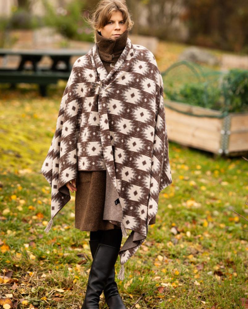 Tunn ullkofta med långt framstycke som kan knytas fram eller bak, alternativt fästas med medföljande spänne.
