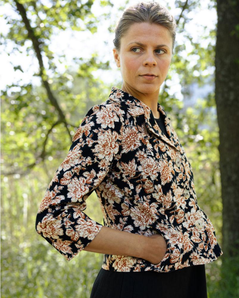 Brun kort fiskbensvävd ullkappa med sned knäppning och flätade skinnknappar. Fickor med ficklock som kan vikas in.