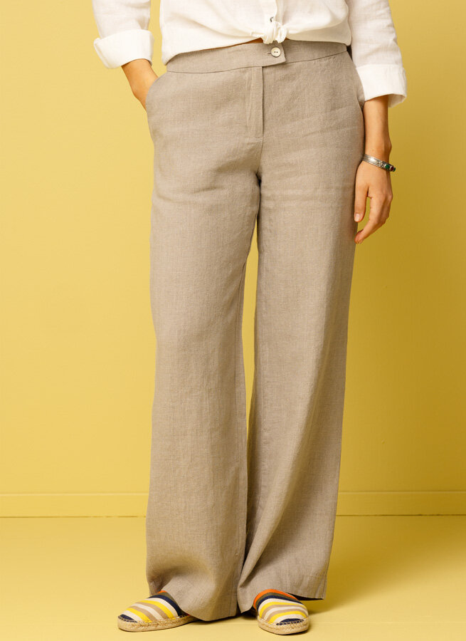 Vidare linnebyxa i mellangrov linnekvalité, aningen sänkt i midjan och med fickor i sidorna. Byxorna är rymliga i storlekarna.