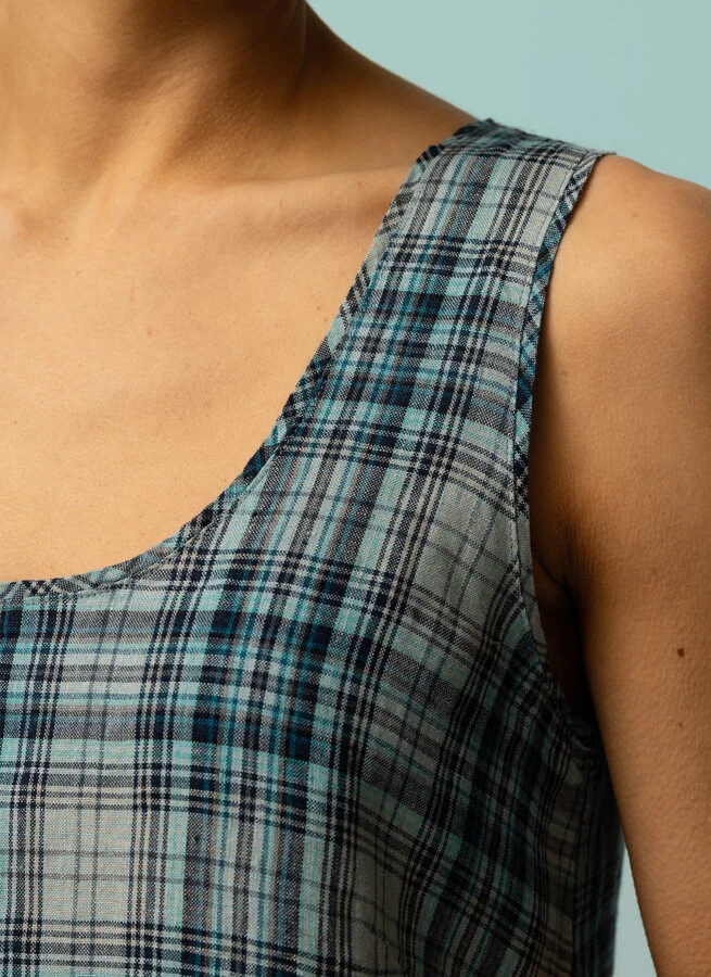 Blårutigt rymligt linne i 100% lin med små slitsar i sidorna.