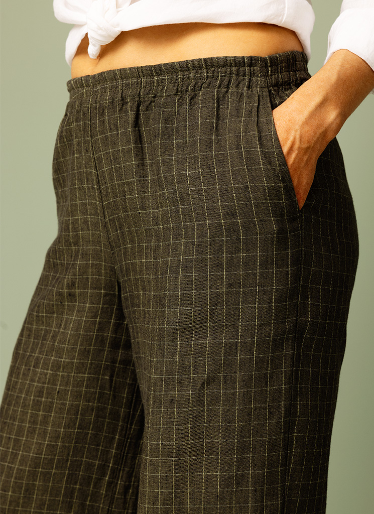 Tunna grönrutiga linnebyxor med resår i midjan. Fickor i sidorna.