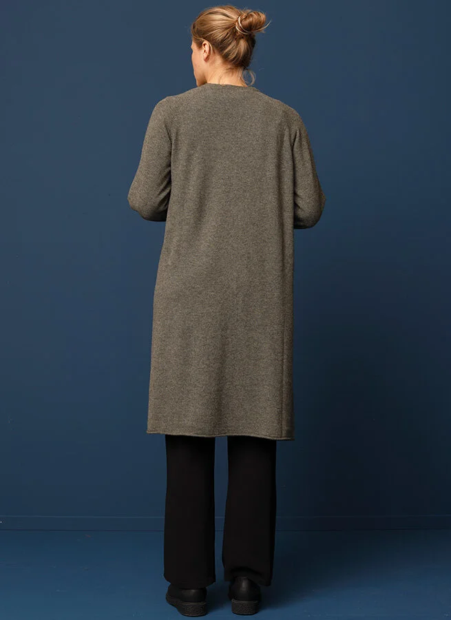 En riktigt lång stickad ullkofta med härlig vidd. Koftan är V-ringad, har slitsar i sidorna och är stickad i 100% jakull.