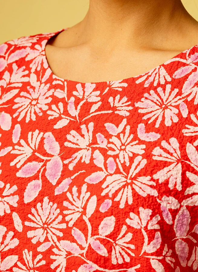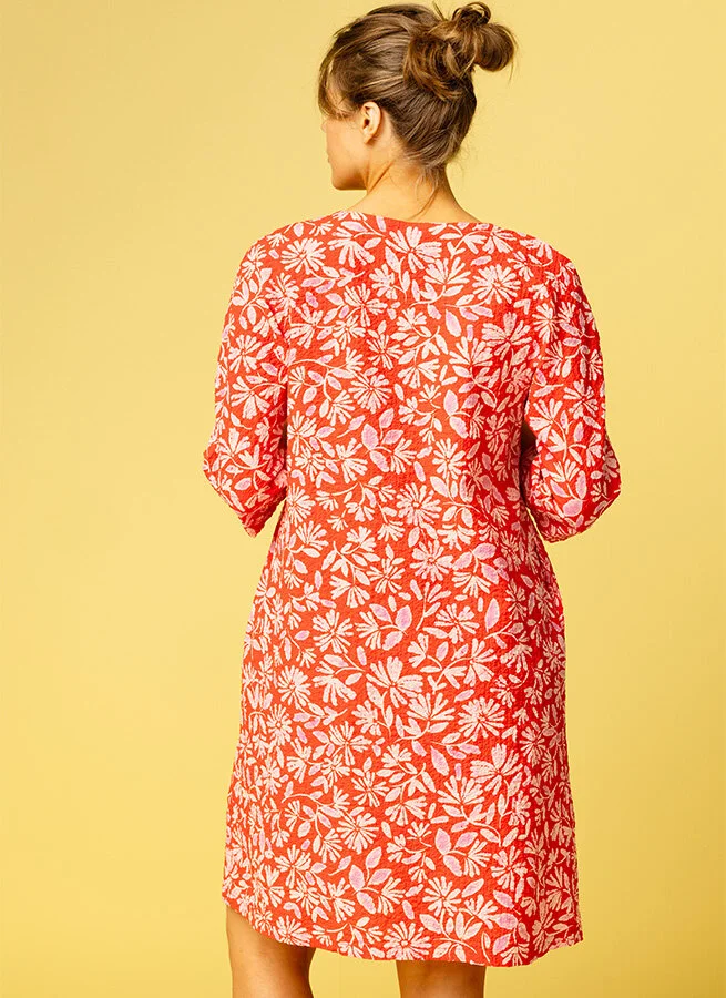 Blommig, röd klänning i rymlig form med kimonoärm. Klänningen är sydd i en bomullskvalité med lätt bubblig struktur med skön sommarkänsla.