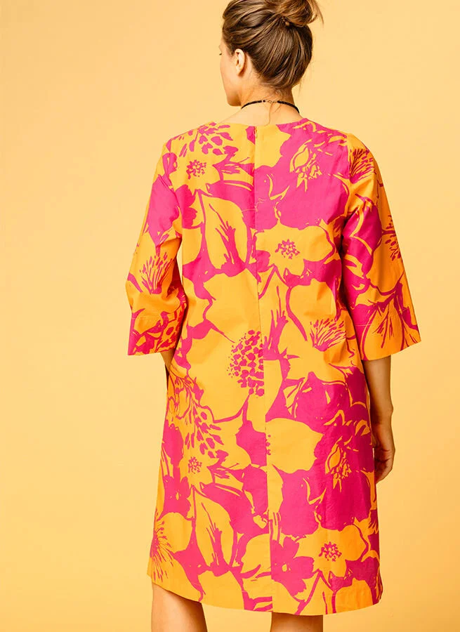 Stormönstrad klänning med trekvartsärm, fickor i sidorna och blixtlås bak.