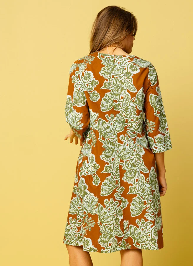 Stormönstrad klänning med trekvartsärm, fickor i sidorna och blixtlås bak.