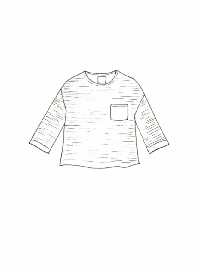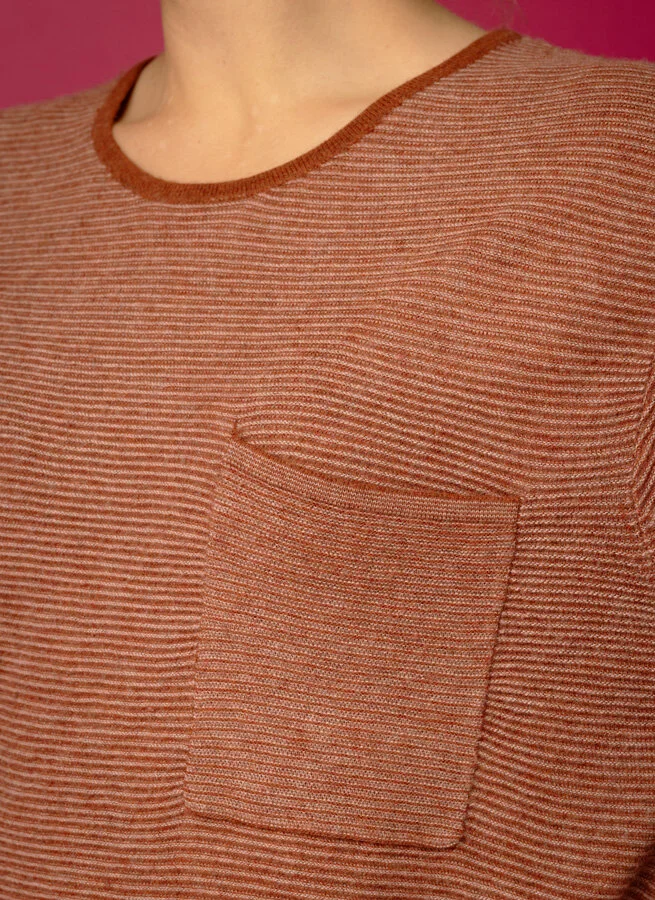 Smalrandig boxig ulltröja med ficka på bröstet och kortare vid ärm.