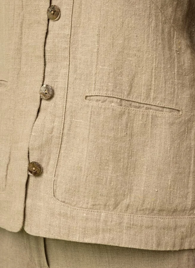 Kraglös, ofodrad linnejacka i grovt lin. Fickor fram.
