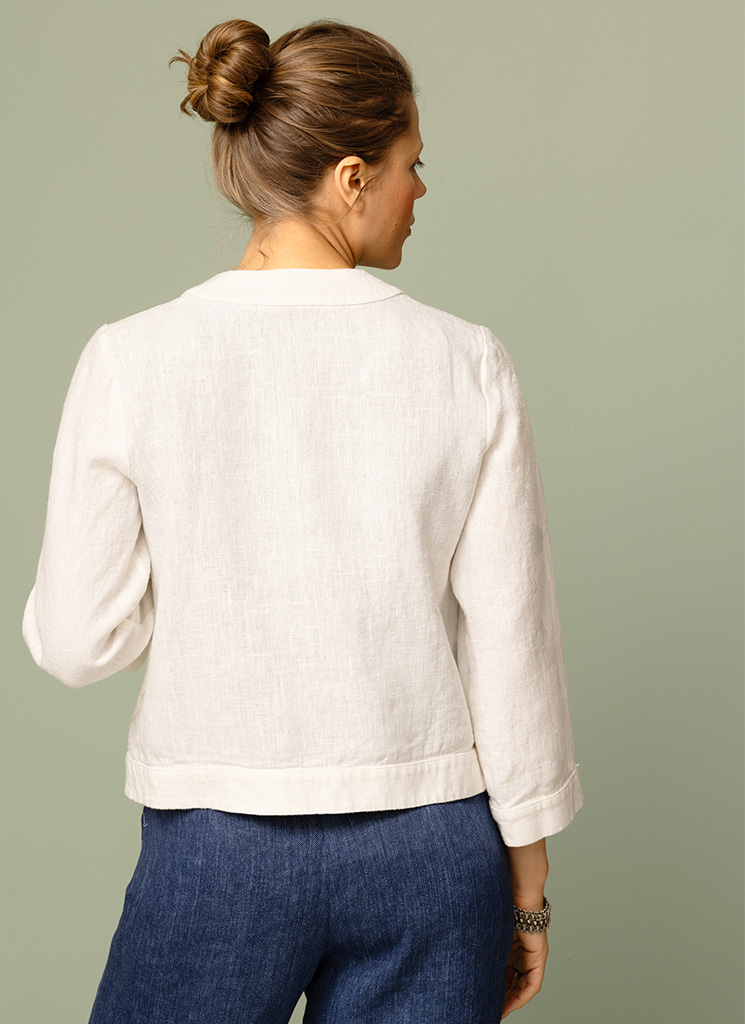 Kraglös, ofodrad linnejacka med fickor fram.