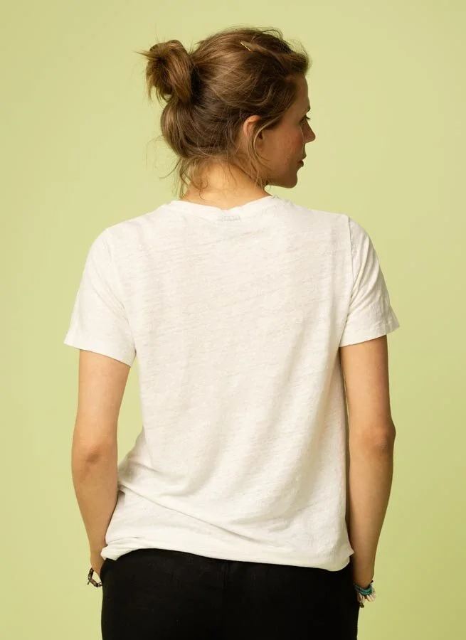 En t-shirt i linne med smickrande V-ringning. Babben är stickad i tunt fint lin och har en behagligt avslappnad form.