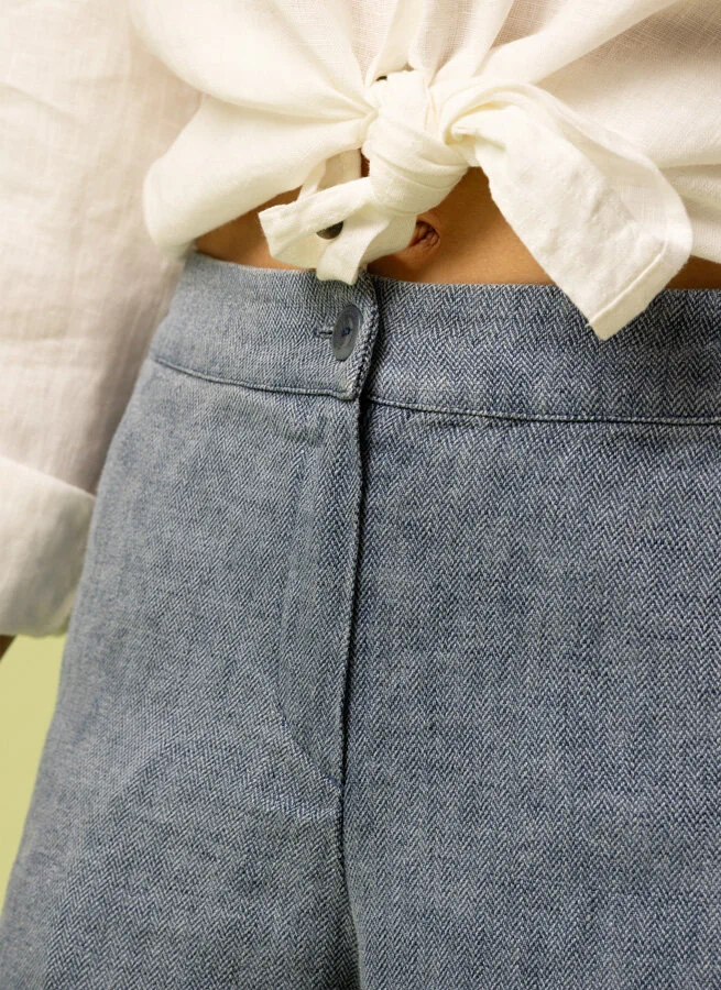 Vid fiskbensvävd linnebyxa med knäppning fram och fickor. Linning och resår baktill för bästa passform.