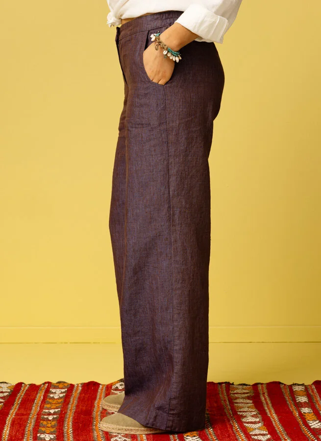 Byxan består av 100% vävt lin, ett fantastiskt naturligt och miljövänligt material som låter din kropp andas. Linet har också en vacker lyster och oregelbundenhet i sin väv och blir bara vackrare och vackrare med tiden. Plagget har förtvättats och därigenom också förkrympts men töjer sig vid användning. Vid tvätt drar byxan sedan ihop sig igen. Tillverkningen sker hos ett litet familjeföretag i Litauen som vi arbetat med sedan många år tillbaka. Linet är odlat i Europa.