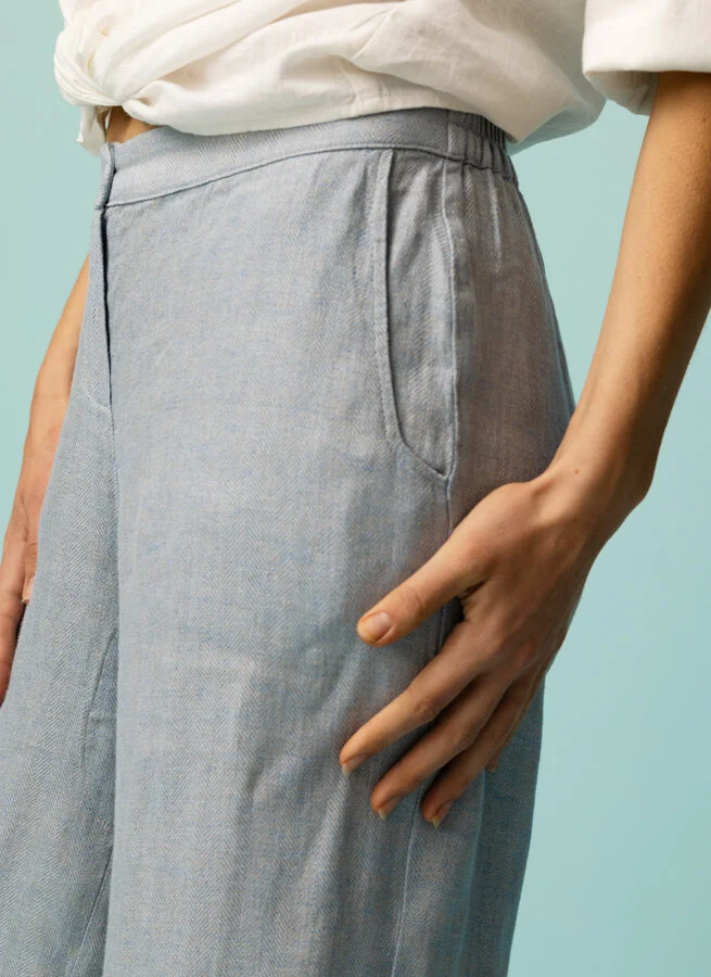 Vid ljusblå linnebyxa i fiskbensmönstrat lin och resår baktill för bästa passform.