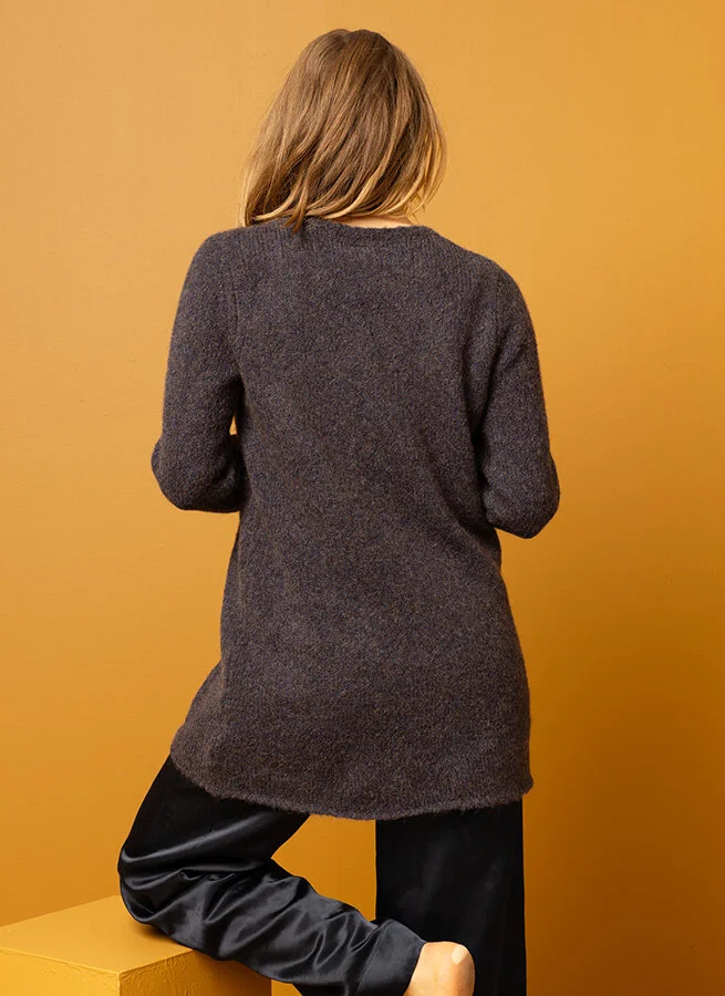 Lång stickad ulltröja med ribbad, rund halsringning.