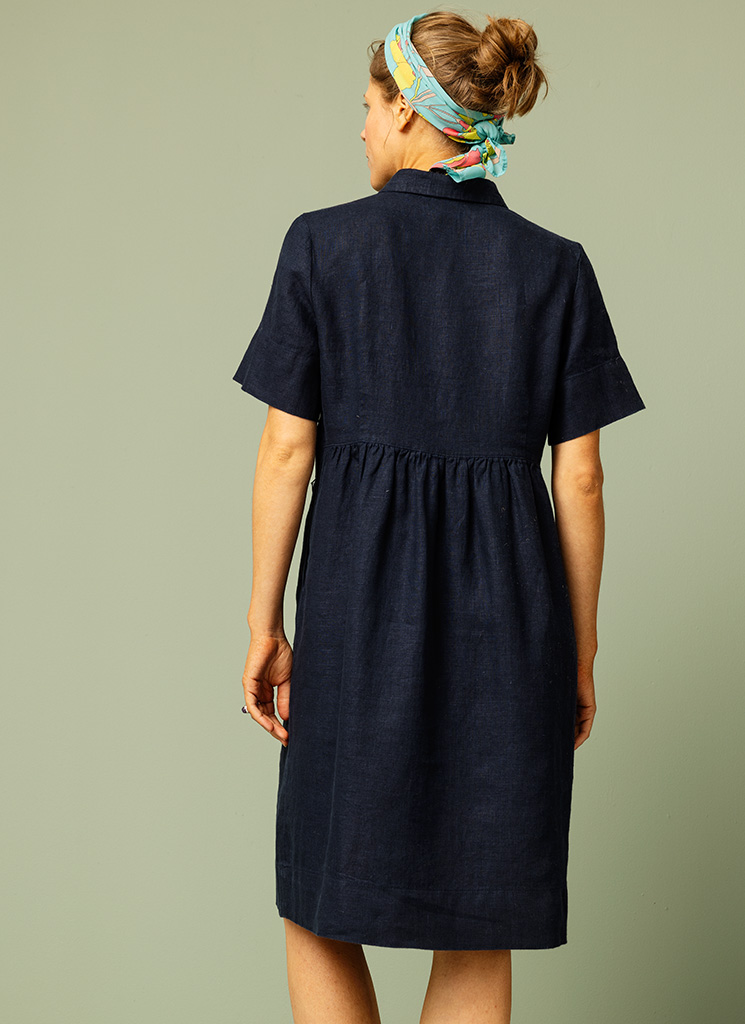 Vid mörkblå klänning med skjortkrage och kortare ärm med uppvik. Knappar fram och fickor i sidorna.