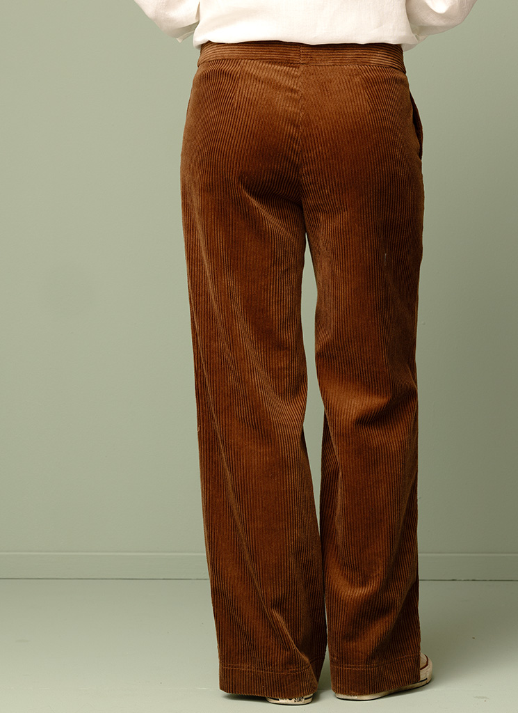Bredspårig manchesterbyxa med vida ben. Fickor i sidorna och dubbla knappar ovanför gylfen.