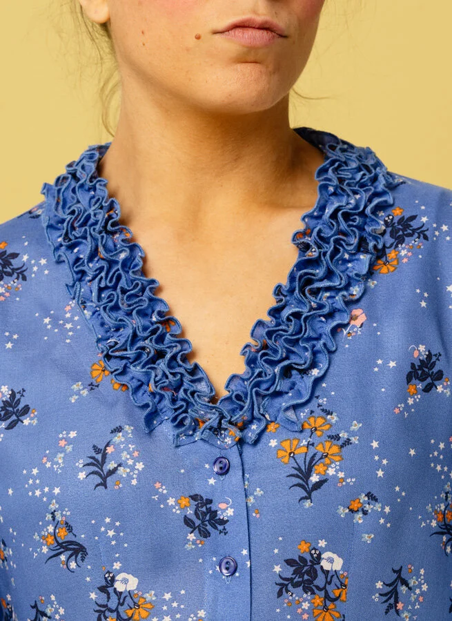 Nätt blåmönstrad blus med krås runt den V-ringade halsringningen.