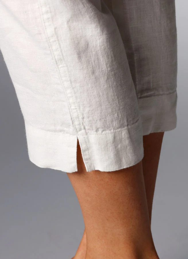 Omtyckt trekvartsbyxa i linne. Byxan har sänkt midja, liten slits på benslut och blixtlås i sidan. En Capribyxa som framhäver benens finaste del!