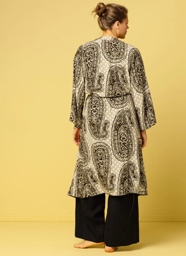 Lång mönstrad kimono i lyxig viskos med härlig tyngd. Knytband i midjan och fickor fram.