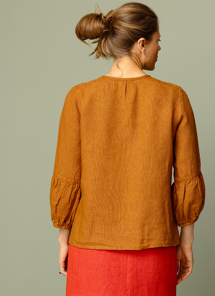 Tidlös linneblus med lätt puffad nederdel på ärm och rynk på axlarna.
