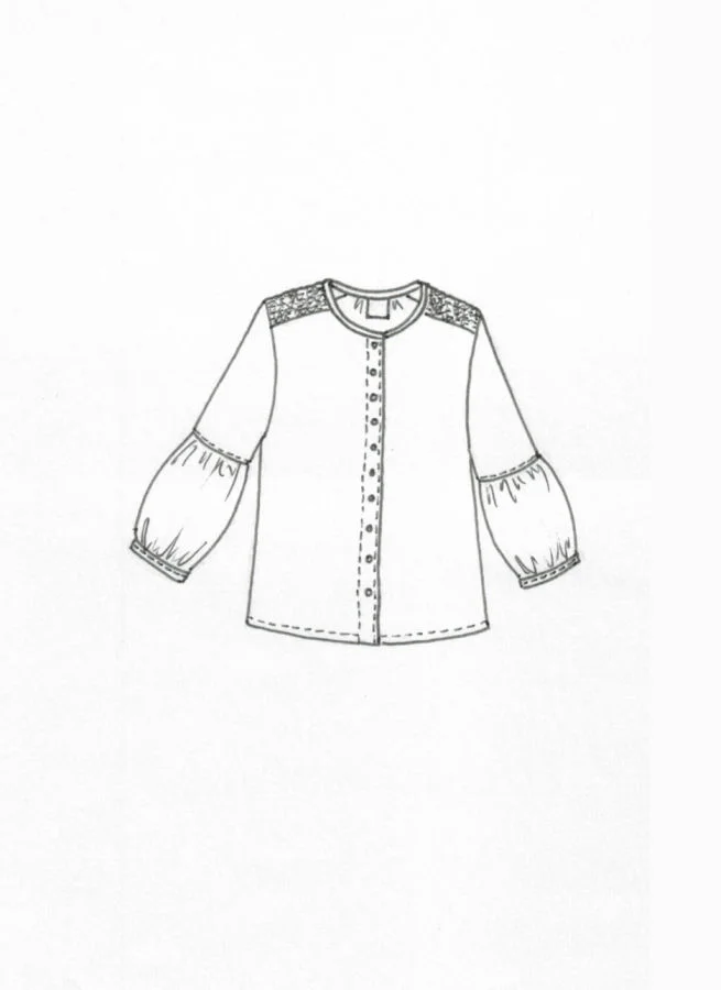 Tidlös linneblus med lätt puffad nederdel på ärm och rynk på axlarna.