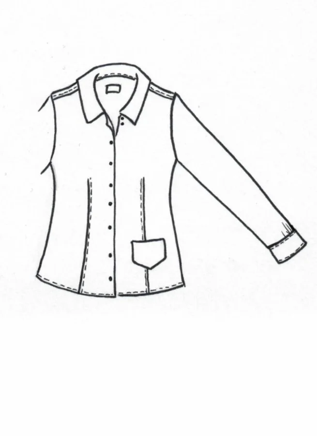 Svart figursydd linneskjorta eller linneblus med liten utanpåliggande ficka.