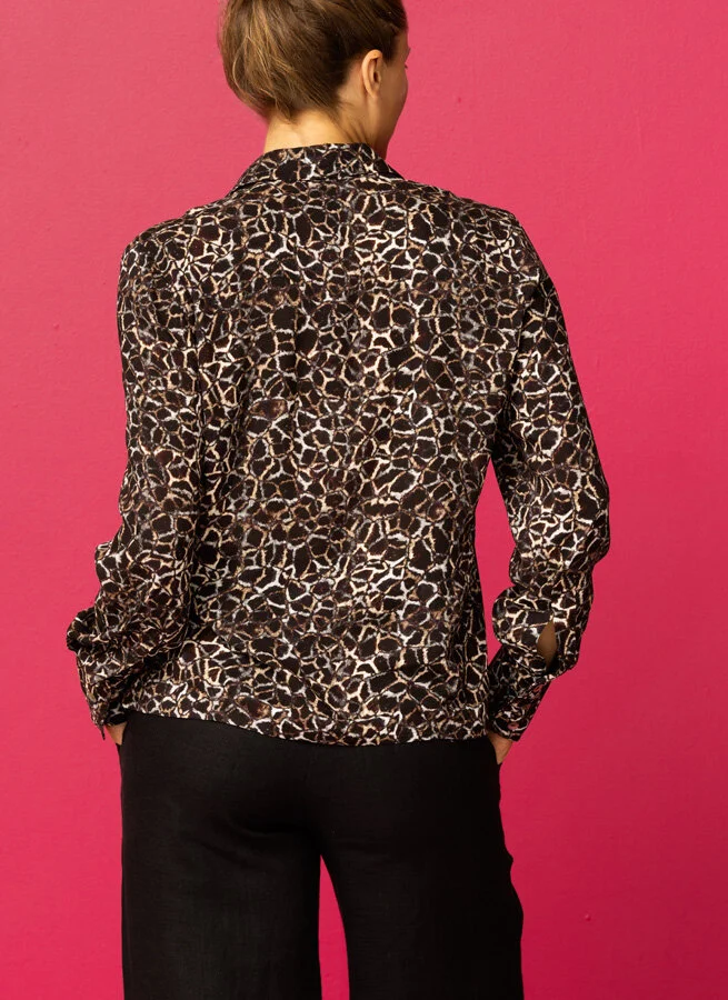 Figursydd blus i mönstrad viskos i svarta, grå och beigebruna toner.