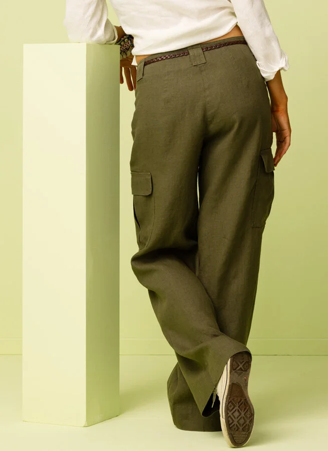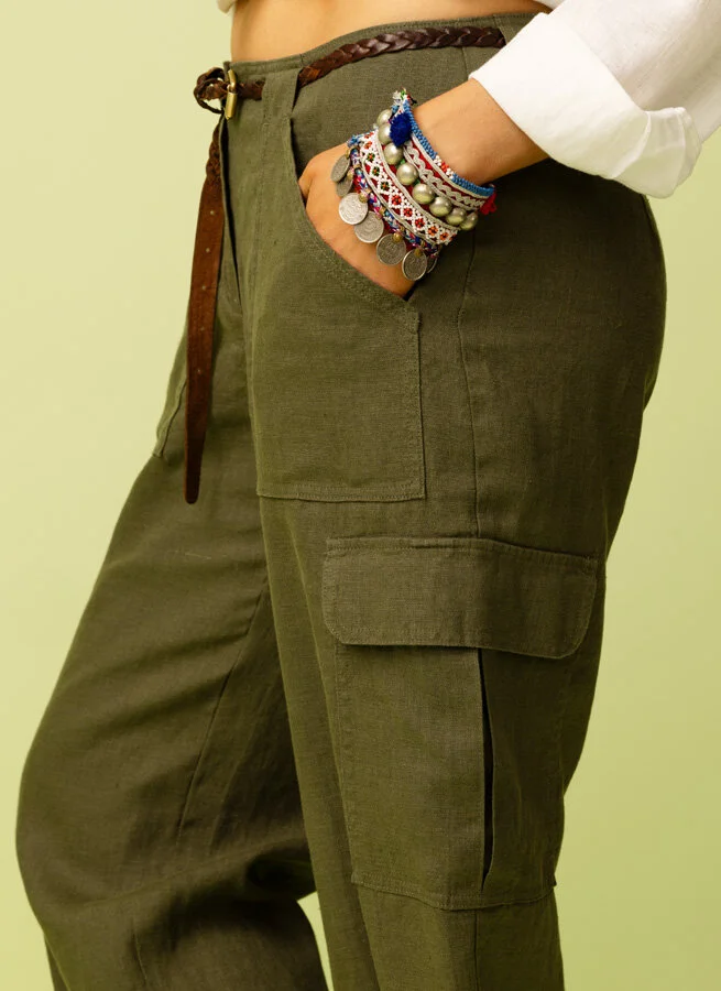 Ledig linnebyxa/cargobyxa med utanpåfickor fram och benfickor med ficklock.