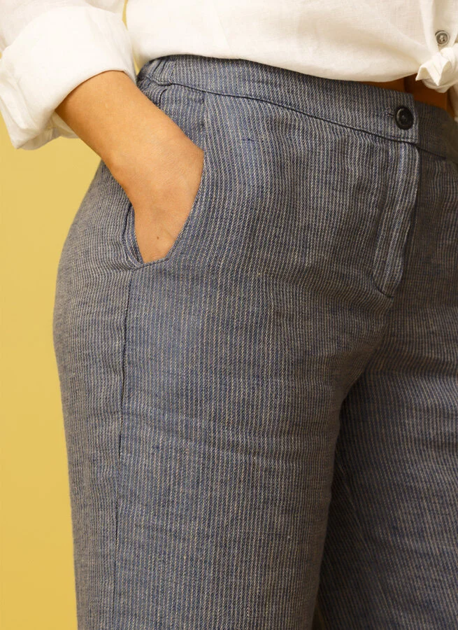 Blårandig, aningen kortare linnebyxa med härlig vidd. Fickor i sidorna och gylf. Resår bak i midjan för skön passform.