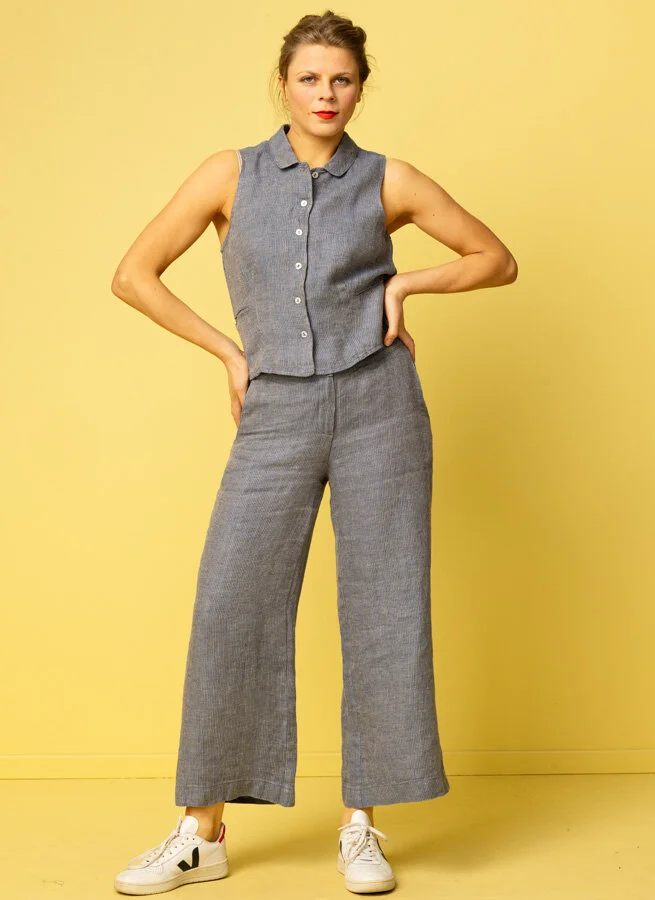 Byxan består av 100% vävt lin, ett fantastiskt naturligt och miljövänligt material som låter din kropp andas. Linet har också en vacker lyster och oregelbundenhet i sin väv och blir bara vackrare och vackrare med tiden. Plagget har förtvättats och därigenom också förkrympts men töjer sig vid användning. Vid tvätt drar byxan sedan ihop sig igen. Tillverkningen sker hos ett litet familjeföretag i Litauen som vi arbetat med sedan många år tillbaka. Linet är odlat i Europa.