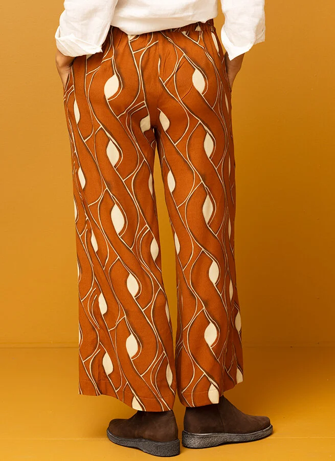 Vid, aningen kortare byxa i behaglig viskos. Den mönstrade byxan har resår baktill för bästa passform. Här matchad med klänningen Alba i samma tyg.