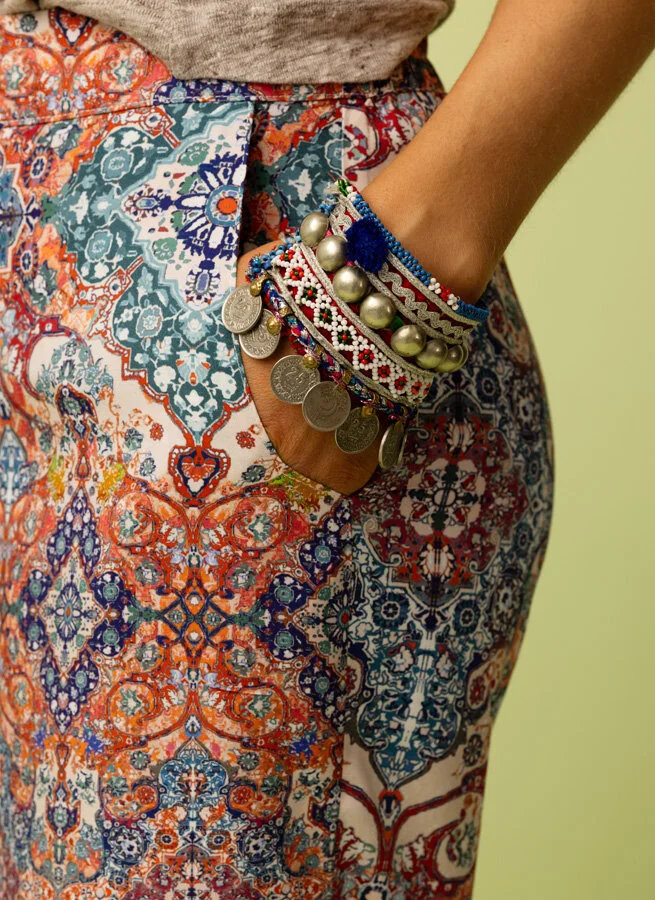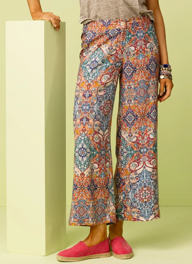 Vid, aningen kortare byxa i behaglig viskos. Den mönstrade byxan har resår baktill och fickor i sidorna