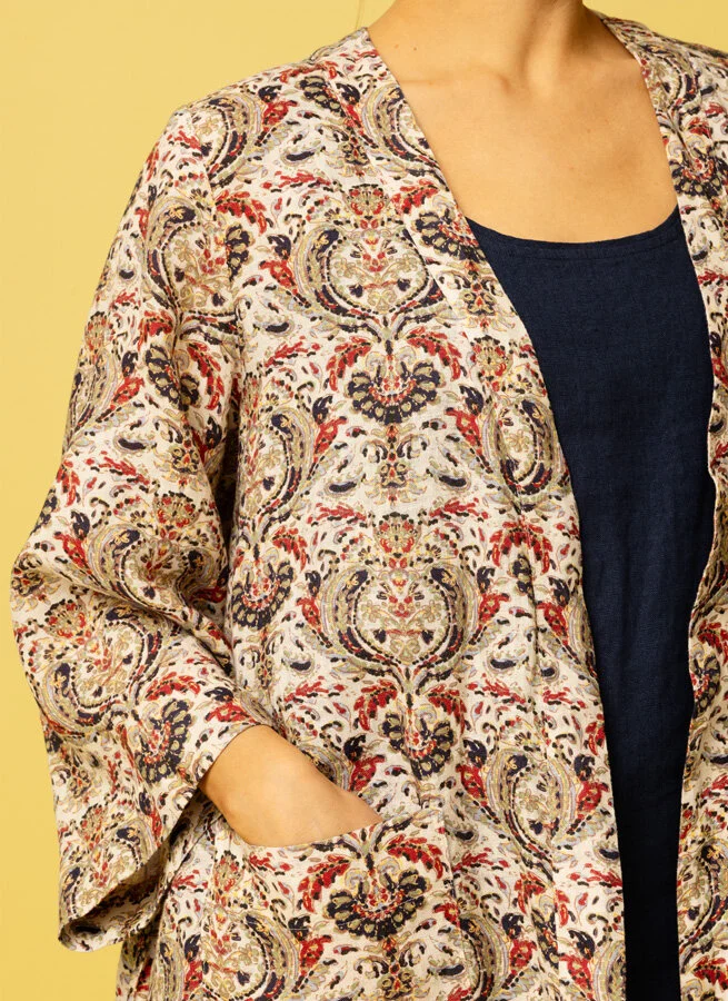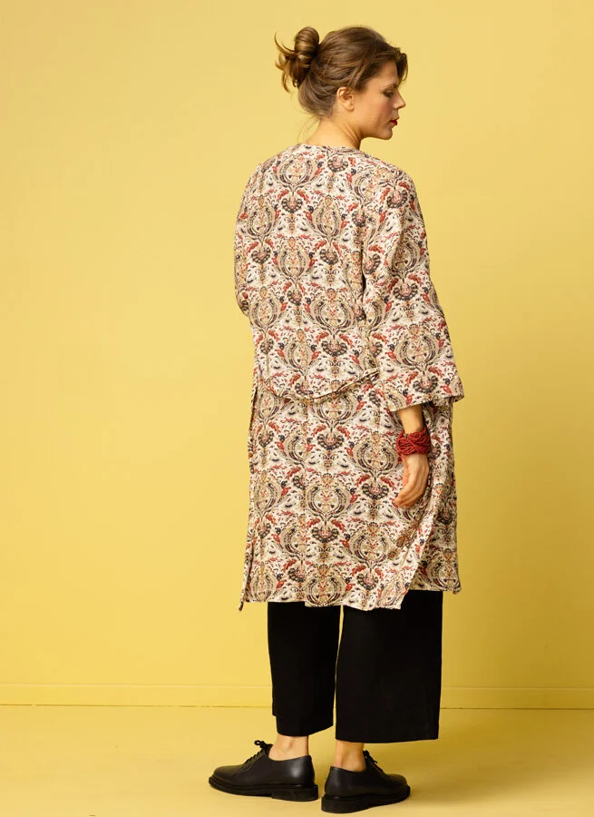 Mönstrad Kimono med trekvartsärm, knytband i midjan och fickor. Matchas gärna med byxa Babar.