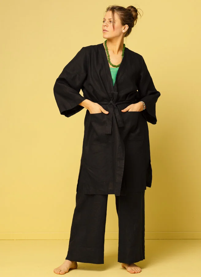 Svart Kimono med trekvartsärm, knytband i midjan och fickor. Matchas gärna med byxa Babar.