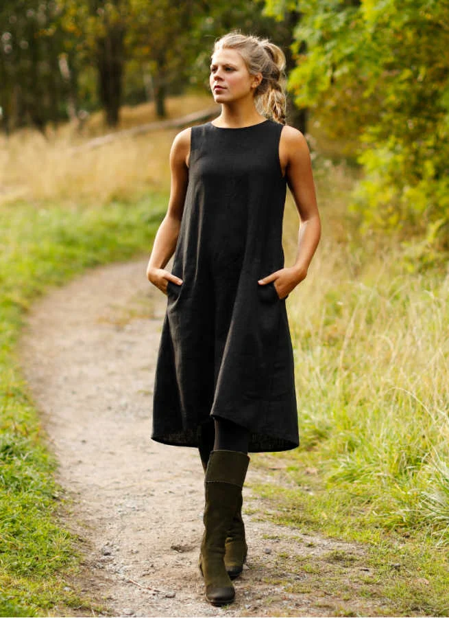 Aningen utställd linneklänning med extra vidd i det något längre bakstycket. Blixtlås bak och fickor i sidorna.