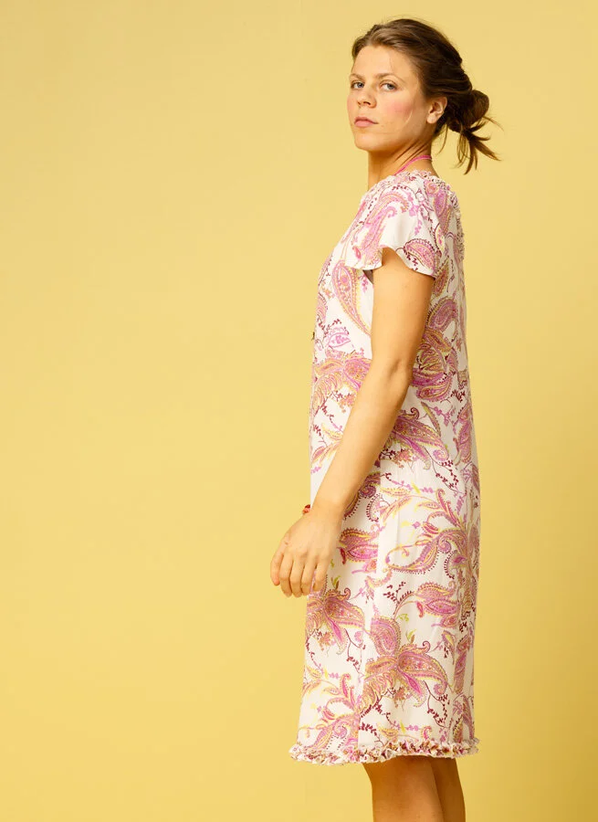 Kortärmad klänning med krås kring halsringningen samt nedtill. Blixtlås i sidan.