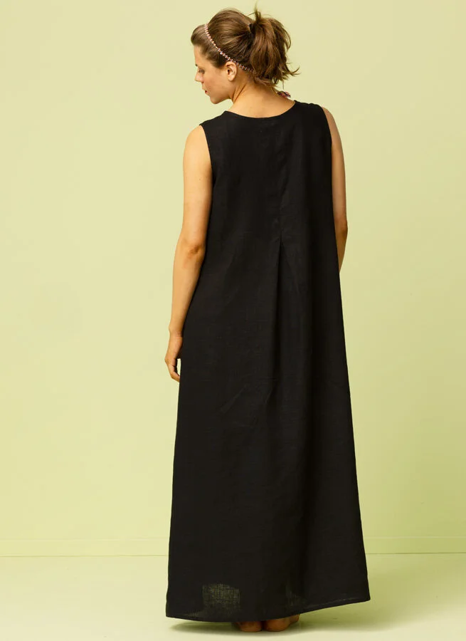 Svart ärmlös klänning med motveck fram och bak. En lång och rymlig linneklänning med fickor i sidorna.