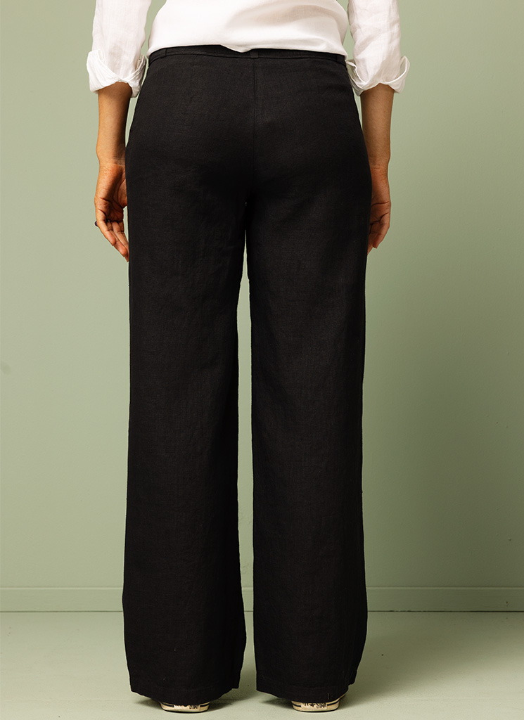 Svart linnebyxa i rak form med fickor i sidorna.