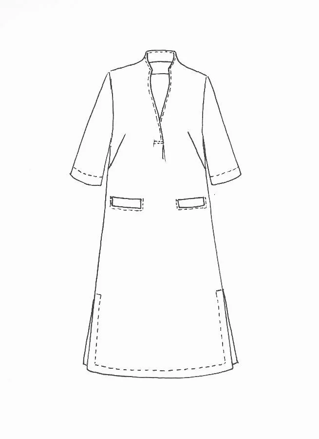 V-ringad lång kaftan/klänning med fickor fram och slitsar i sidorna. Det mjuka viskostyget med grön botten har ett vackert fint fall.