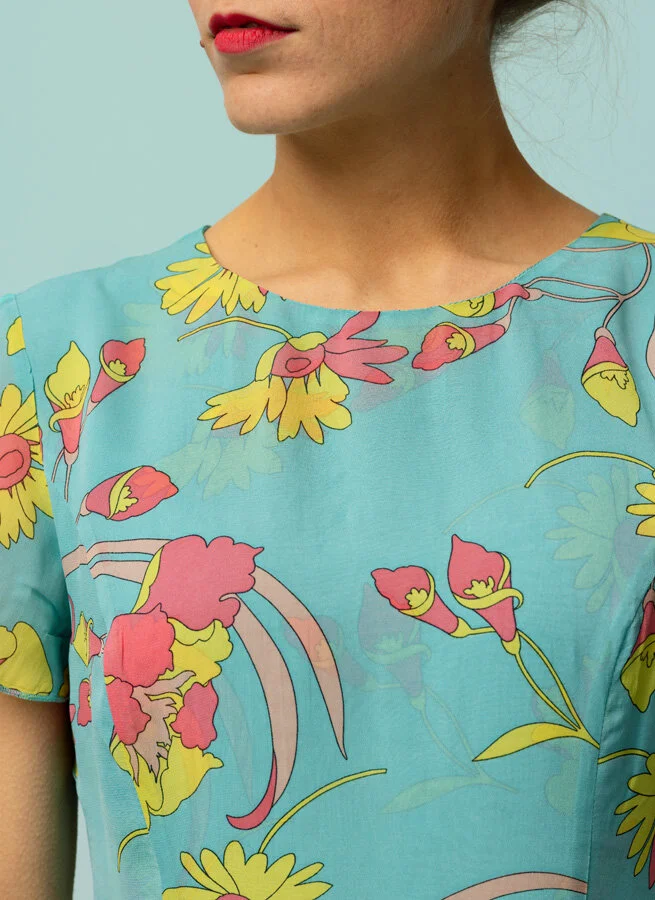 Populär klänning sydd i tunt dubbelt tunt viskostyg med korta ärmar och förlängande prinsesskärning.