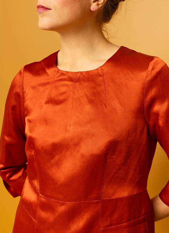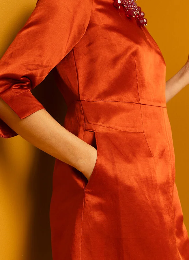 Plagget är tillverkat av en blandning av acetat (en slags viskos), lin och bomull med en vacker lyster som höjer festkänslan.