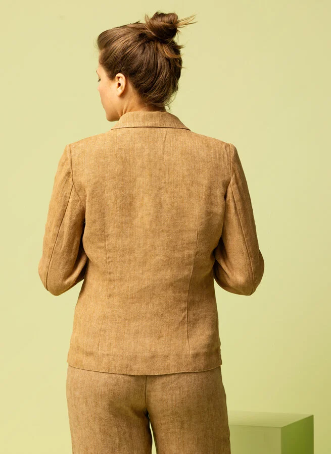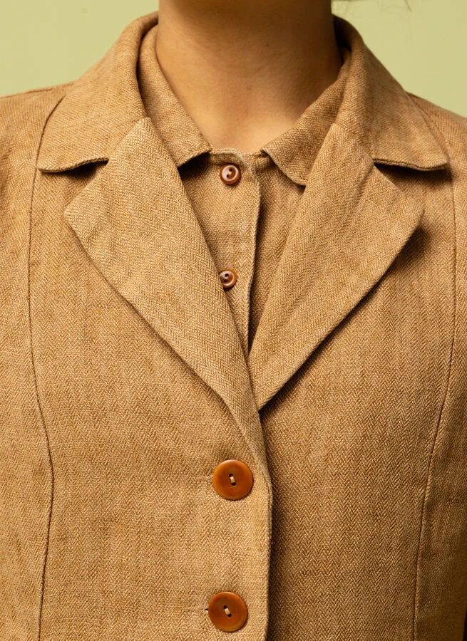 Figursydd nätt kavaj i fiskbensvävt lin. En linnekavaj med fickor och knappar av Taguanöt.