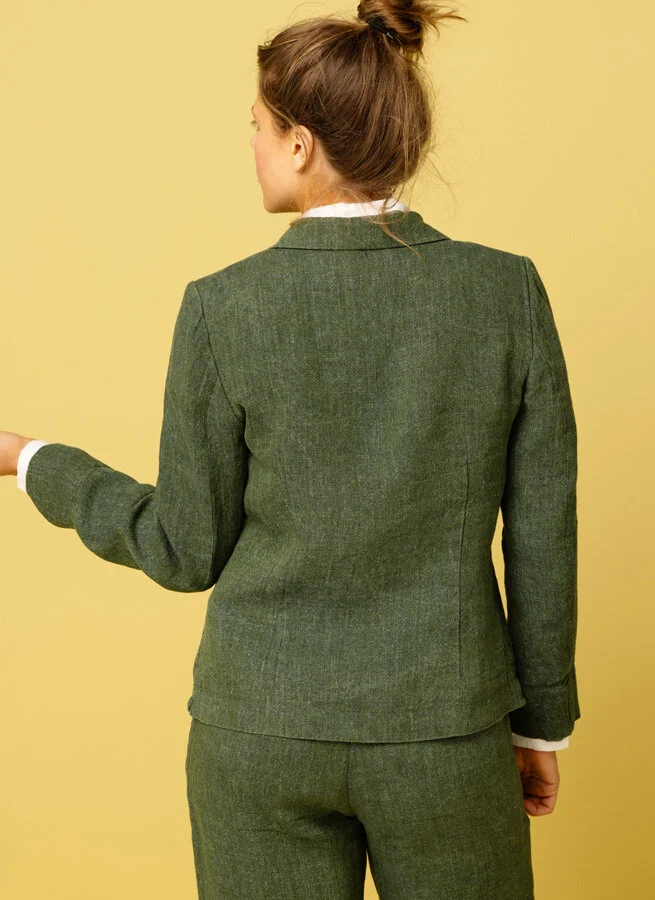 Kavajen består av en grov linnekvalité med "kornig" struktur. Tillverkningen sker hos ett litet familjeföretag i Litauen som vi arbetat med sedan många år tillbaka. Tyget kommer från Italien.