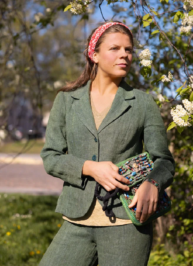 Figursydd grönblå kavaj i grovt lin. En linnekavaj med fickor och knappar av Taguanöt.