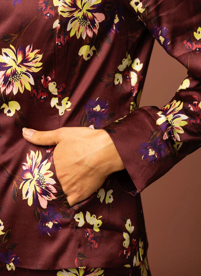Kavajen är tillverkad i en glansig viskos med inslag av 3% elastan för skön stretch.