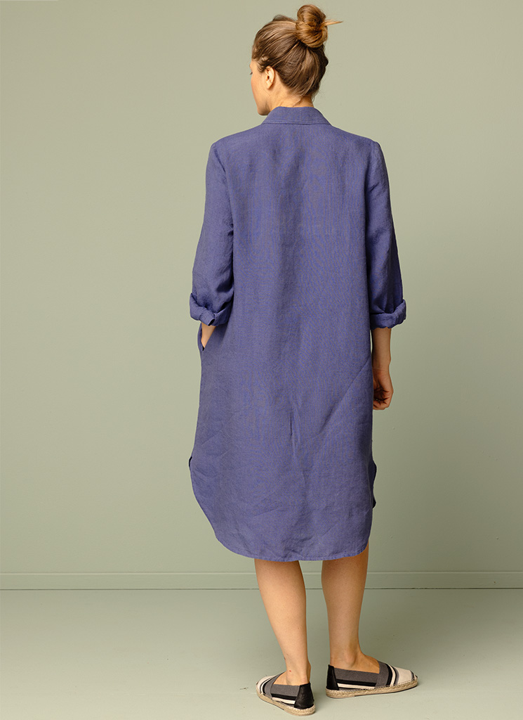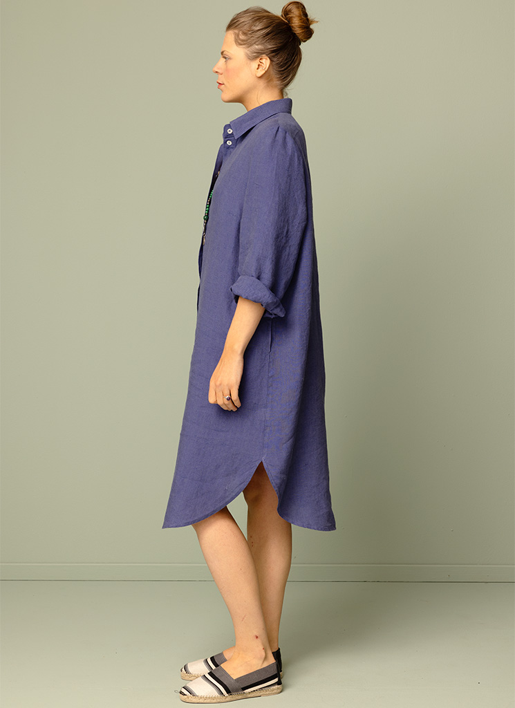 Lång blå linneskjorta med rundad nederkant och fickor i sidorna.