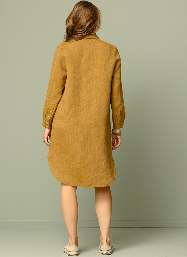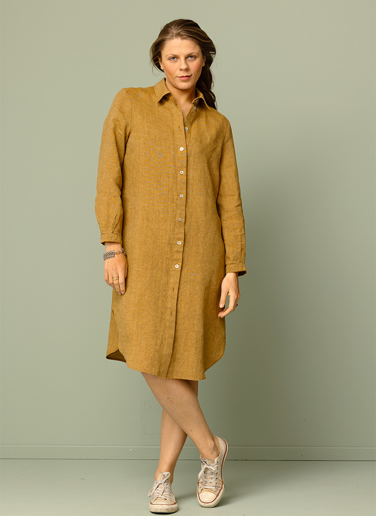 Lång brungul linneskjorta med rundad nederkant och fickor i sidorna.