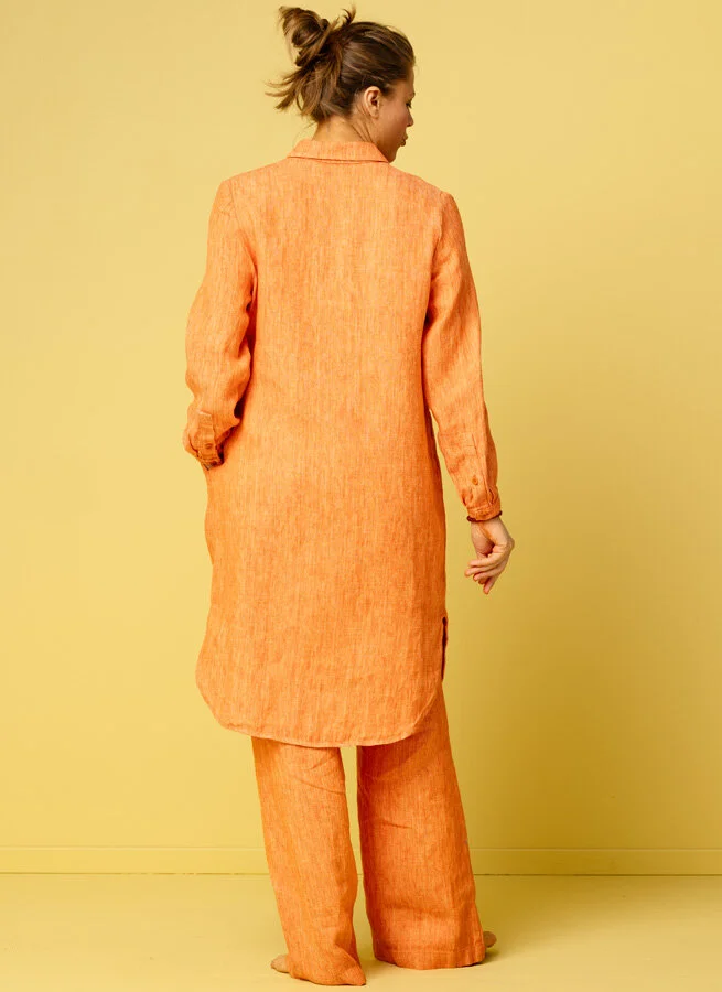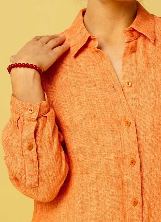 Lång orange fiskbensvävd linneskjorta med fickor i sidorna.