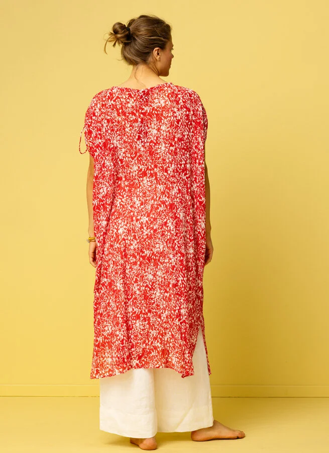 Rymlig och ledig strandklänning i krinklad viskos. Klänningen regleras med knytband i halsringningen och på ärmarna.