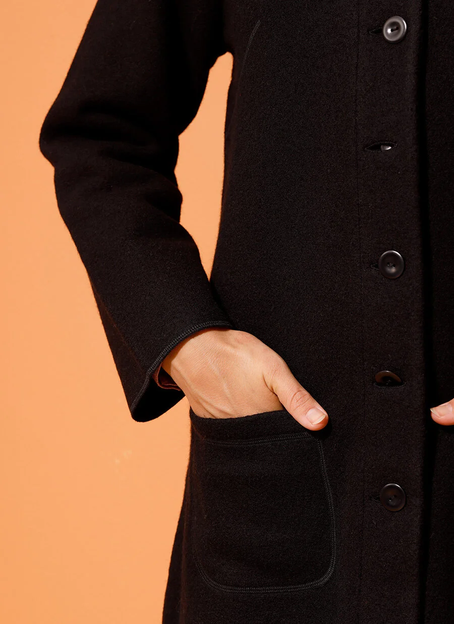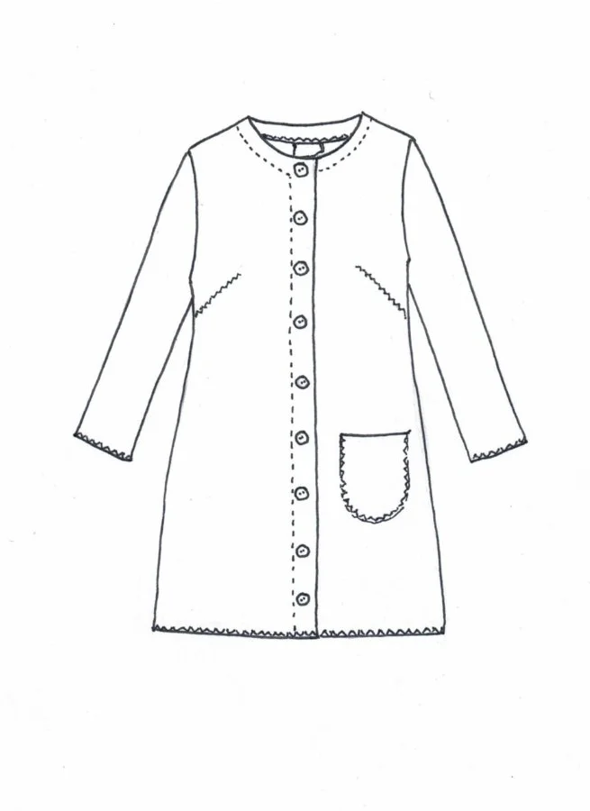 Kraglös kappa eller kofta i 100% kokad ull. Jackan är lite längre och räcker ner över stussen för att hålla dig extra varm.