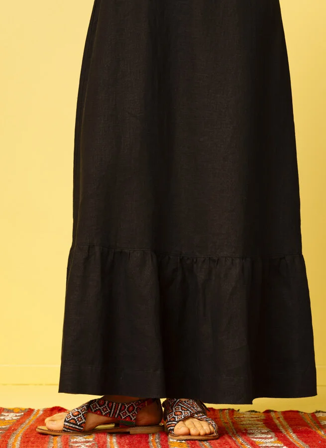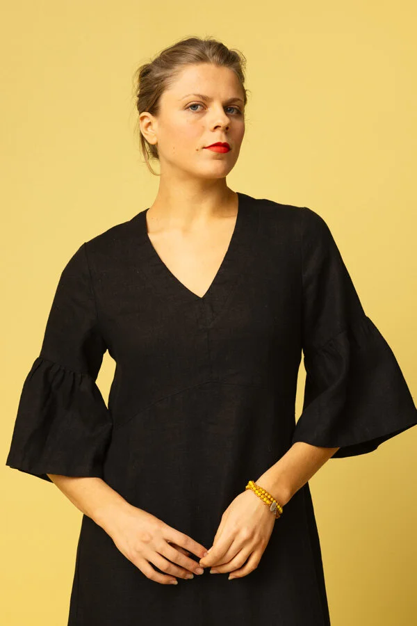 Svart, lång V-ringad linneklänning med trekvartsärm och blixtlås bak.
